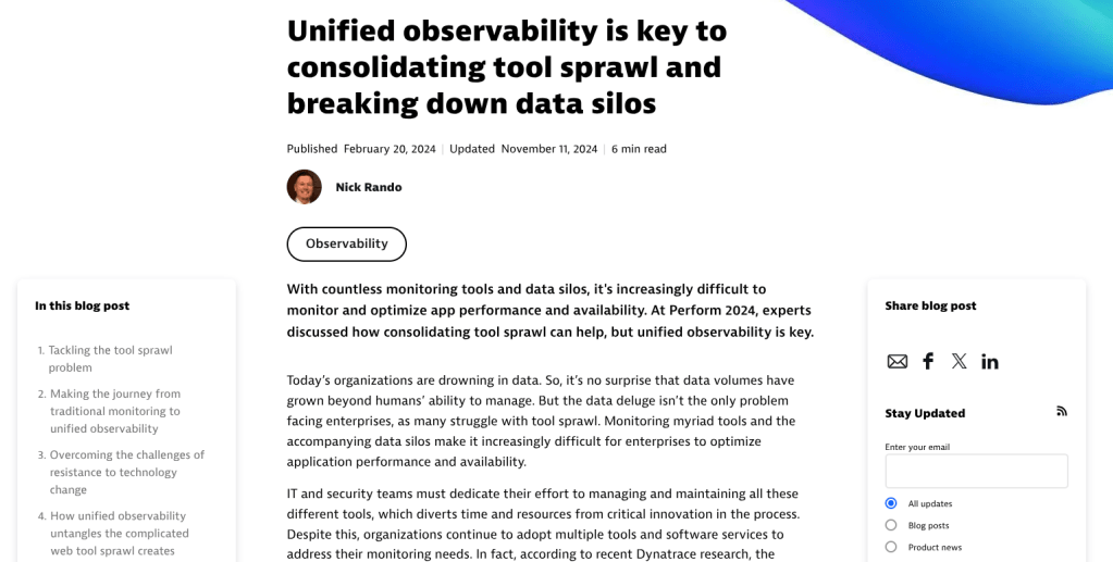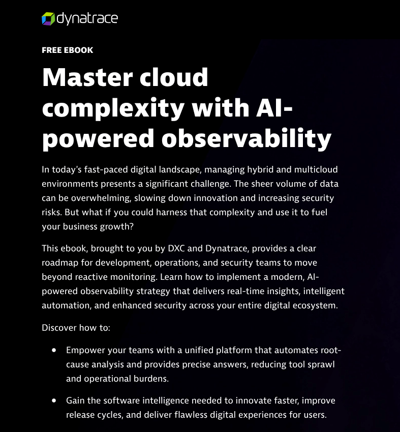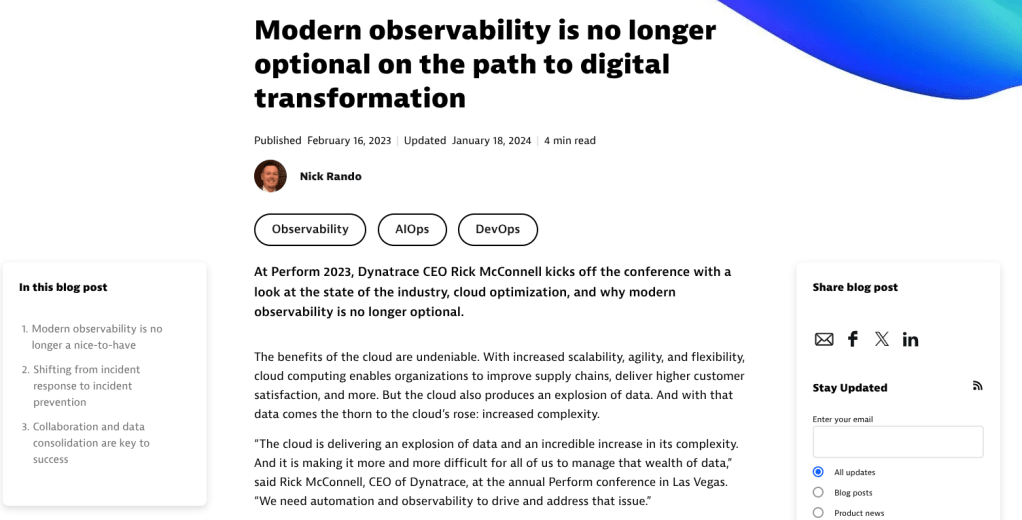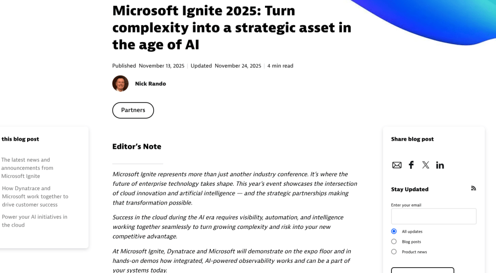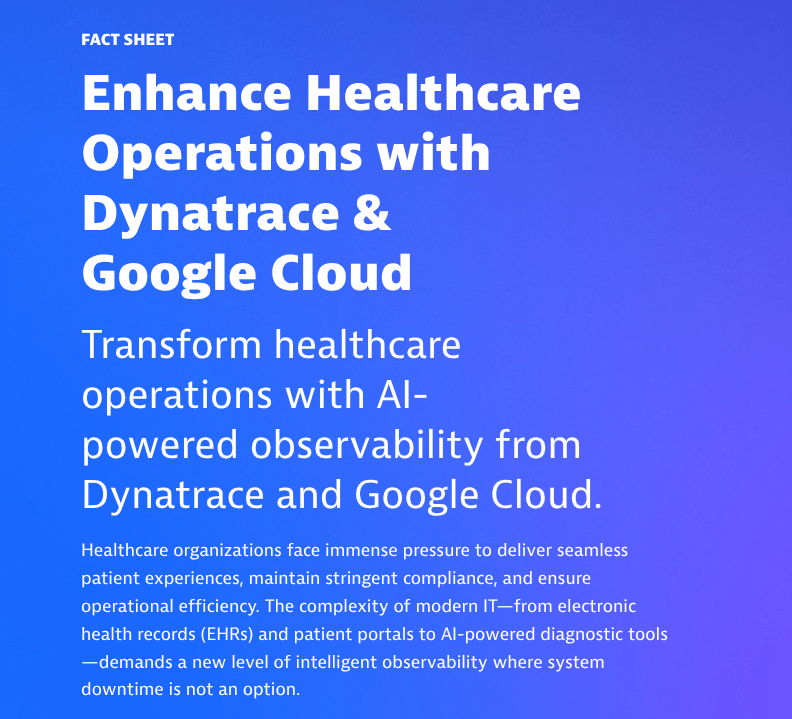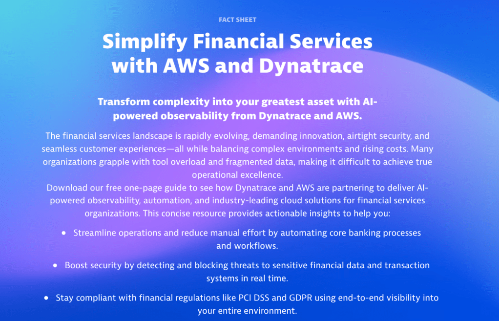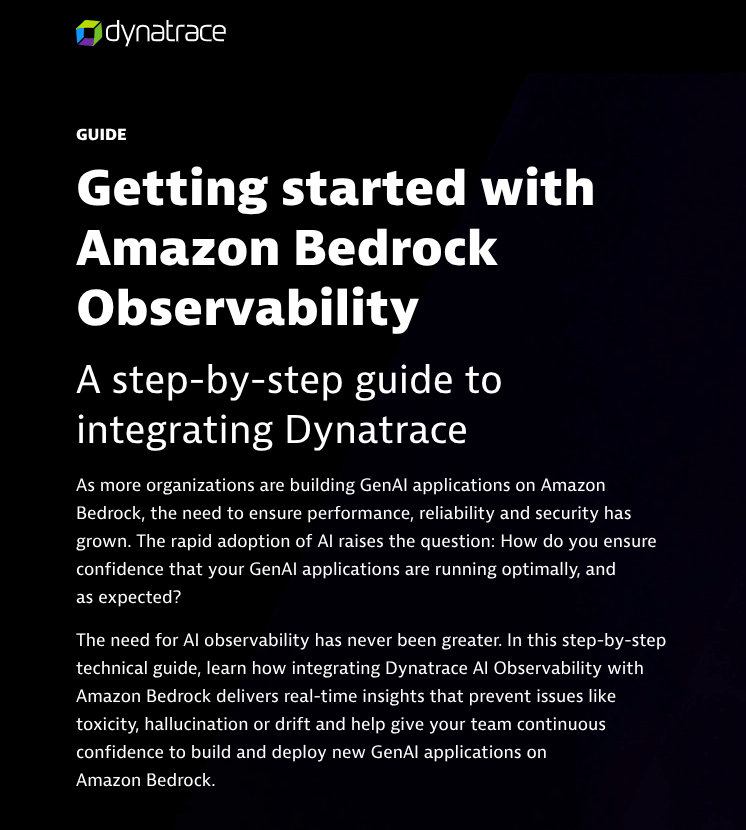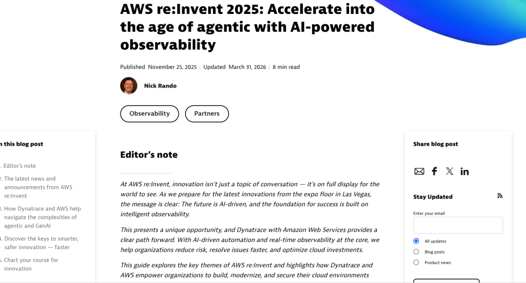 A Dynatrace blog covering its technology alliance with Nutanix ahead of the Nutanix .NEXT conference.A joint white paper written by Rando covering the partnership between Dynatrace and DXC.A high-performing conference guide covering AWS re:Invent, the latest Dynatrace announcements, and more.A BOFU technical guide that takes a deep dive into the power of observability for Amazon Bedrock.This conference guide focuses on Microsoft Ignite and includes a look at how Dynatrace and Microsoft work together.This joint ebook focuses on Dynatrace’s partnership with AWS in the age of agentic AI.Covering Dynatrace Perform, this blog breaks down the insights from key speakers at the event.This strategic fact sheet breaks down the benefits of Dynatrace on AWS for financial services organizations.This blog looks into the importance of tool consolidation for modern observability.This fact sheet breaks down how Dynatrace and Google Cloud tackle the complexity facing healthcare organizations.From the expo floor, this blog summarizes Dynatrace CEO Rick McConnell’s keynote at Perform.